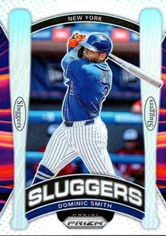 The Dominic Smith 2021 Prizm #SL7 Sluggers - Silver card is 1 of 5 Dominic Smith's card variations in the 2021 Prizm set being tracked by Sports Card Investor, including Sluggers, Sluggers - Gold /10, Sluggers - Black Finite /1, and Sluggers - Gold Vinyl /1.