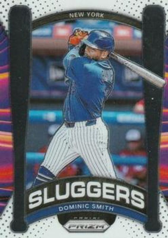 The Dominic Smith 2021 Prizm #SL7 Sluggers card is 1 of 5 Dominic Smith's card variations in the 2021 Prizm set being tracked by Sports Card Investor, including Sluggers - Silver, Sluggers - Gold /10, Sluggers - Black Finite /1, and Sluggers - Gold Vinyl /1.