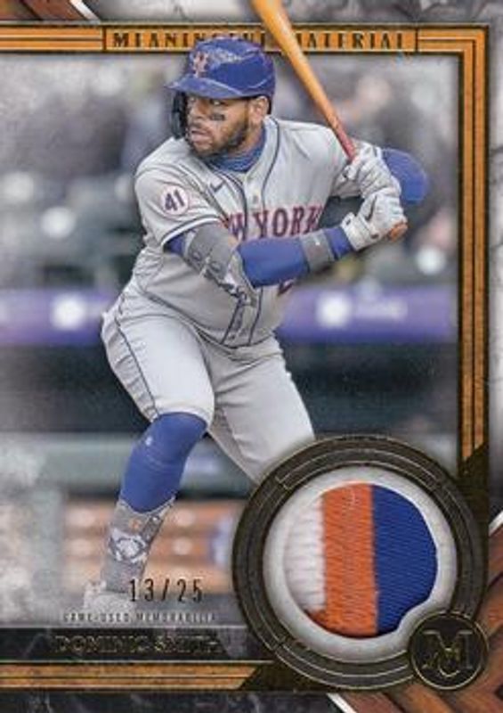 The Dominic Smith 2022 Topps Museum Collection #MMR1-DS Meaningful Materials Relics - Gold /25 card is 1 of 5 Dominic Smith's card variations in the 2022 Topps Museum Collection set being tracked by Sports Card Investor, including Meaningful Materials Relics /50, Meaningful Materials Relics - Copper /35, Meaningful Materials Relics - Ruby /10, and Meaningful Materials Relics - Emerald /1.
