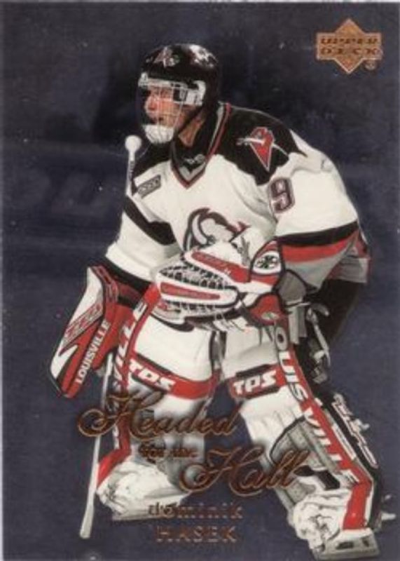 The Dominik Hasek 1999 Upper Deck #HOF-2 Headed for the Hall card is 1 of 34 Dominik Hasek's card variations in the 1999 Upper Deck set being tracked by Sports Card Investor, including #145 Base, #22 Base, #145 UD Exclusives /100, #22 UD Exclusives /100, and #145 UD Exclusives 1/1 /1.