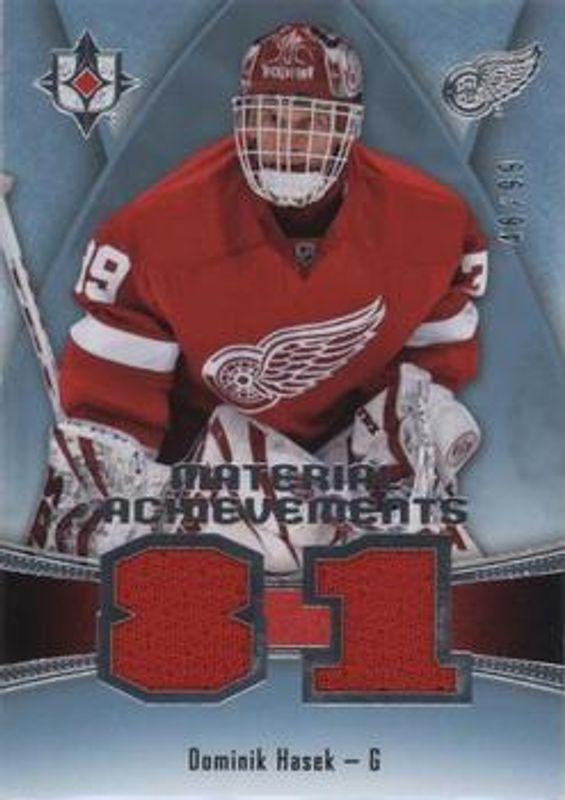The Dominik Hasek 2015 Upper Deck Ultimate Collection #MA-HA Material Achievements /99 card is 1 of 5 Dominik Hasek's card variations in the 2015 Upper Deck Ultimate Collection set being tracked by Sports Card Investor, including Signatures Honoured Materials /35, Material Achievements Gold Patch /5, Material Achievements Spectrum Gold Tag /3, and Signatures Honoured Materials Gold Tag /3.