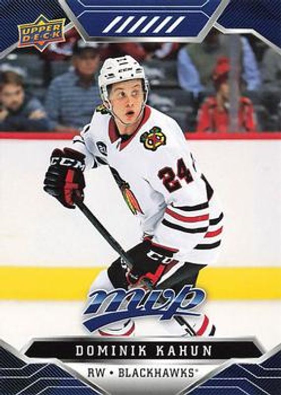 The Dominik Kahun 2019 Upper Deck MVP #174 Blue card is 1 of 13 Dominik Kahun's card variations in the 2019 Upper Deck MVP set being tracked by Sports Card Investor, including Base, Gold Script, Puzzle Backs, Silver Script, and Super Script /25.