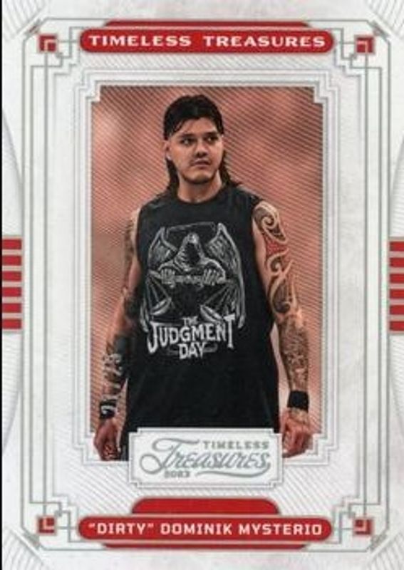 The Dominik Mysterio 2023 Chronicles WWE #TT-11 Timeless Treasures - Holo Silver /25 card is 1 of 58 Dominik Mysterio's card variations in the 2023 Chronicles WWE set being tracked by Sports Card Investor, including #215 Base, #7 Base, #167 Base, #340 Base, and #277 Base.