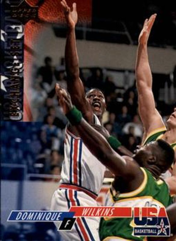 The Dominique Wilkins 1993 Upper Deck Special Edition #USA12 USA Basketball Exchange card is 1 of 6 Dominique Wilkins' card variations in the 1993 Upper Deck Special Edition set being tracked by Sports Card Investor, including Base, Electric Court, Electric Court Gold, Die-Cut All-Stars - Eastern Conference, and Eastern Conference All Stars.