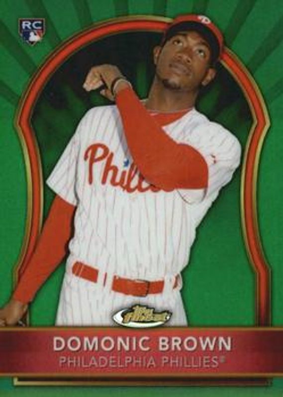 The Domonic Brown 2011 Topps Finest #67 Green Refractor /199 Rookie card is 1 of 18 Domonic Brown's card variations in the 2011 Topps Finest set being tracked by Sports Card Investor, including Base, Refractor /549, X-Fractor /299, Orange Refractor /99, and Gold Refractor /50.