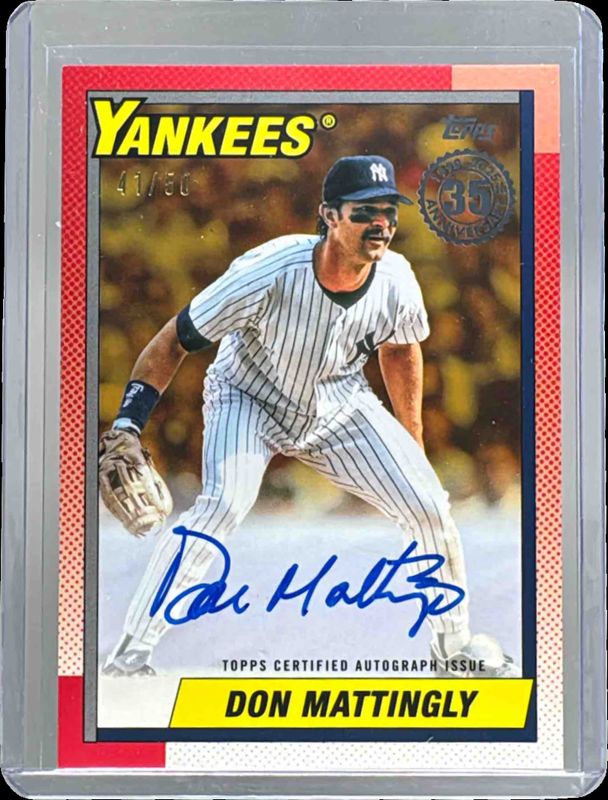 The Don Mattingly 2025 Topps Update #90AU-DM 1990 Topps Autographs - Gold Foil /50 card is 1 of 13 Don Mattingly's card variations in the 2025 Topps Update set being tracked by Sports Card Investor, including 1990 Topps Autographs, Heavy Lumber Autographs Relic, 1990 Topps All-Star Autographs /50, Heavy Lumber /(SSP), and 1990 Topps All-Star Autographs - Orange Foil /25.