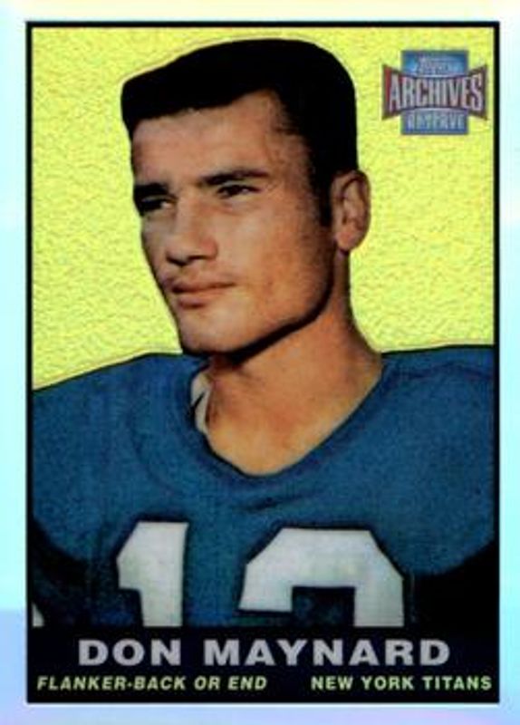The Don Maynard 2001 Topps Archives Reserve #23 Base card is 1 of 3 Don Maynard's card variations in the 2001 Topps Archives Reserve set being tracked by Sports Card Investor, including Mini Helmet Autographs, and Rookie Reprint Autographs.