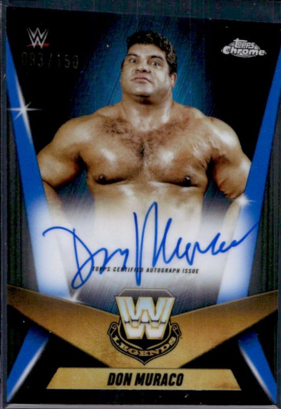 The Don Muraco 2025 Topps Chrome WWE #LCA-DM Legendary Chrome Autographs - Blue Refractor /150 card is 1 of 14 Don Muraco's card variations in the 2025 Topps Chrome WWE set being tracked by Sports Card Investor, including Legendary Chrome Autographs, Legendary Chrome Autographs - Geometric Refractor, Legendary Chrome Autographs - Refractor /175, Legendary Chrome Autographs - Gold Geometric Refractor /50, and Legendary Chrome Autographs - Gold Refractor /50.