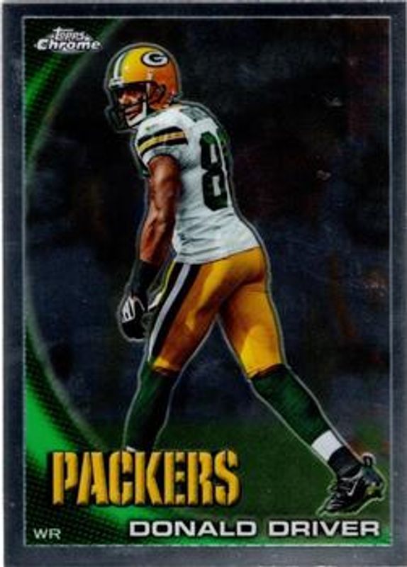 The Donald Driver 2010 Topps Chrome #C42 Base card is 1 of 13 Donald Driver's card variations in the 2010 Topps Chrome set being tracked by Sports Card Investor, including Orange Refractor, Refractor, X-Fractor, Purple Refractor /555, and Blue Refractor /199.