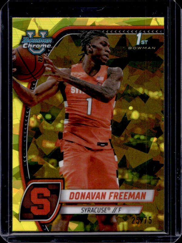The Donavan Freeman 2024 Bowman Chrome University Sapphire Edition #21 Yellow Refractor /75 card is 1 of 27 Donavan Freeman's card variations in the 2024 Bowman Chrome University Sapphire Edition set being tracked by Sports Card Investor, including Base, Purple Refractor /100, Green Refractor /65, Gold Refractor /50, and Orange Refractor /25.
