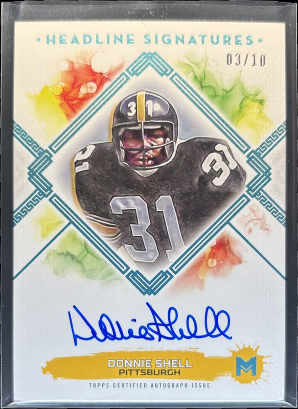 The Donnie Shell 2023 Topps Motif #HS-DS Headline Signatures - Cadium Orange /10 card is 1 of 20 Donnie Shell's card variations in the 2023 Topps Motif set being tracked by Sports Card Investor, including Headline Signatures /99, Motif Endorsements Autographs /99, Headline Signatures - Ultramarine Blue /20, Motif Endorsements Autographs - Ultramarine Blue /20, and Motif Endorsements Autographs - Cadium Orange /10.
