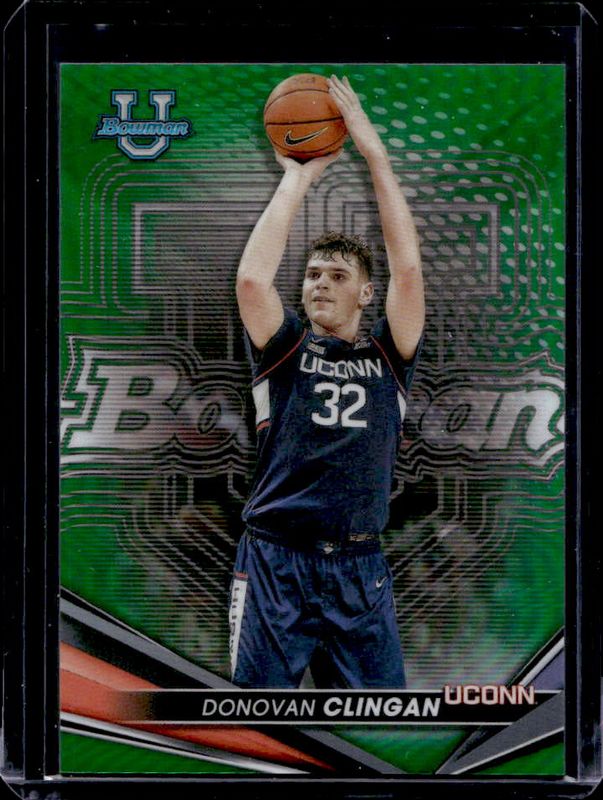 The Donovan Clingan 2022 Bowman Best University #19 Green Refractor /99 card is 1 of 30 Donovan Clingan's card variations in the 2022 Bowman Best University set being tracked by Sports Card Investor, including Base, Refractor, Speckle Refractor, Mini-Diamond Refractor /299, and Purple Refractor /250.