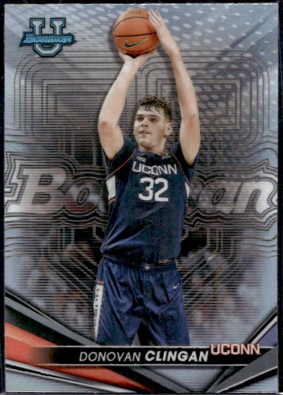 The Donovan Clingan 2022 Bowman Best University #19 Refractor card is 1 of 30 Donovan Clingan's card variations in the 2022 Bowman Best University set being tracked by Sports Card Investor, including Base, Speckle Refractor, Mini-Diamond Refractor /299, Purple Refractor /250, and Aqua Lava Refractor /199.