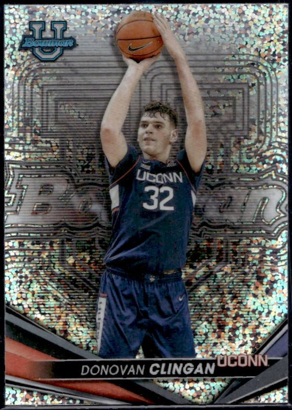 The Donovan Clingan 2022 Bowman Best University #19 Speckle Refractor card is 1 of 30 Donovan Clingan's card variations in the 2022 Bowman Best University set being tracked by Sports Card Investor, including Base, Refractor, Mini-Diamond Refractor /299, Purple Refractor /250, and Aqua Lava Refractor /199.