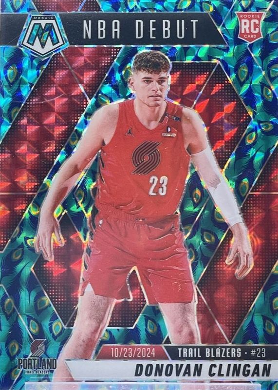 The Donovan Clingan 2024 Mosaic #261 NBA Debut - Choice Peacock /(SSP) Rookie card in Raw condition has not changed in price in the last 30 days and was last sold for $50.00 .
