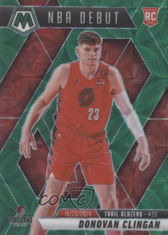 The Donovan Clingan 2024 Mosaic #261 NBA Debut - International Green /15 Rookie card in Raw condition has not changed in price in the last 30 days and was last sold for $5.50 .