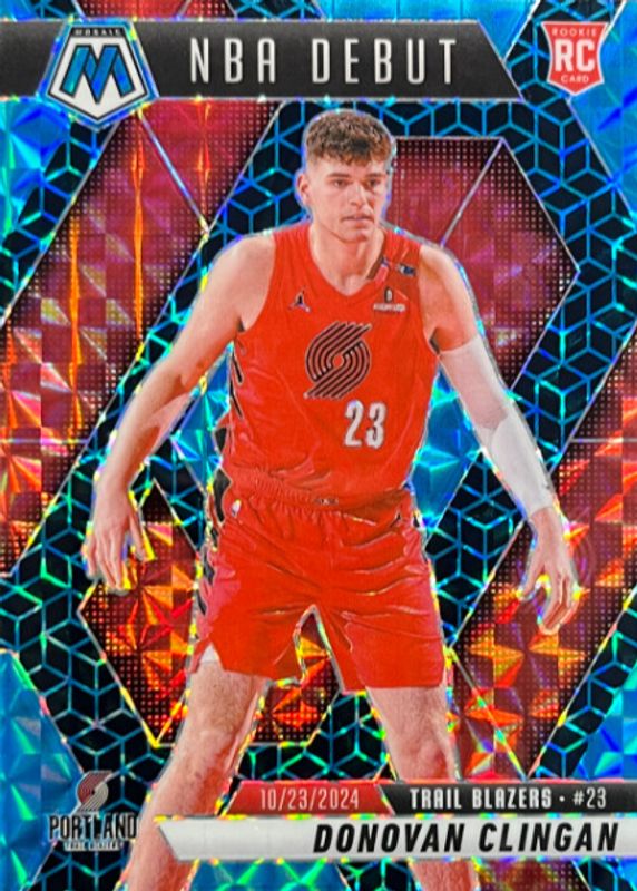 The Donovan Clingan 2024 Mosaic #261 NBA Debut - Spectris Blue FOTL /25 Rookie card in Raw condition has not changed in price in the last 30 days and was last sold for $4.36 .