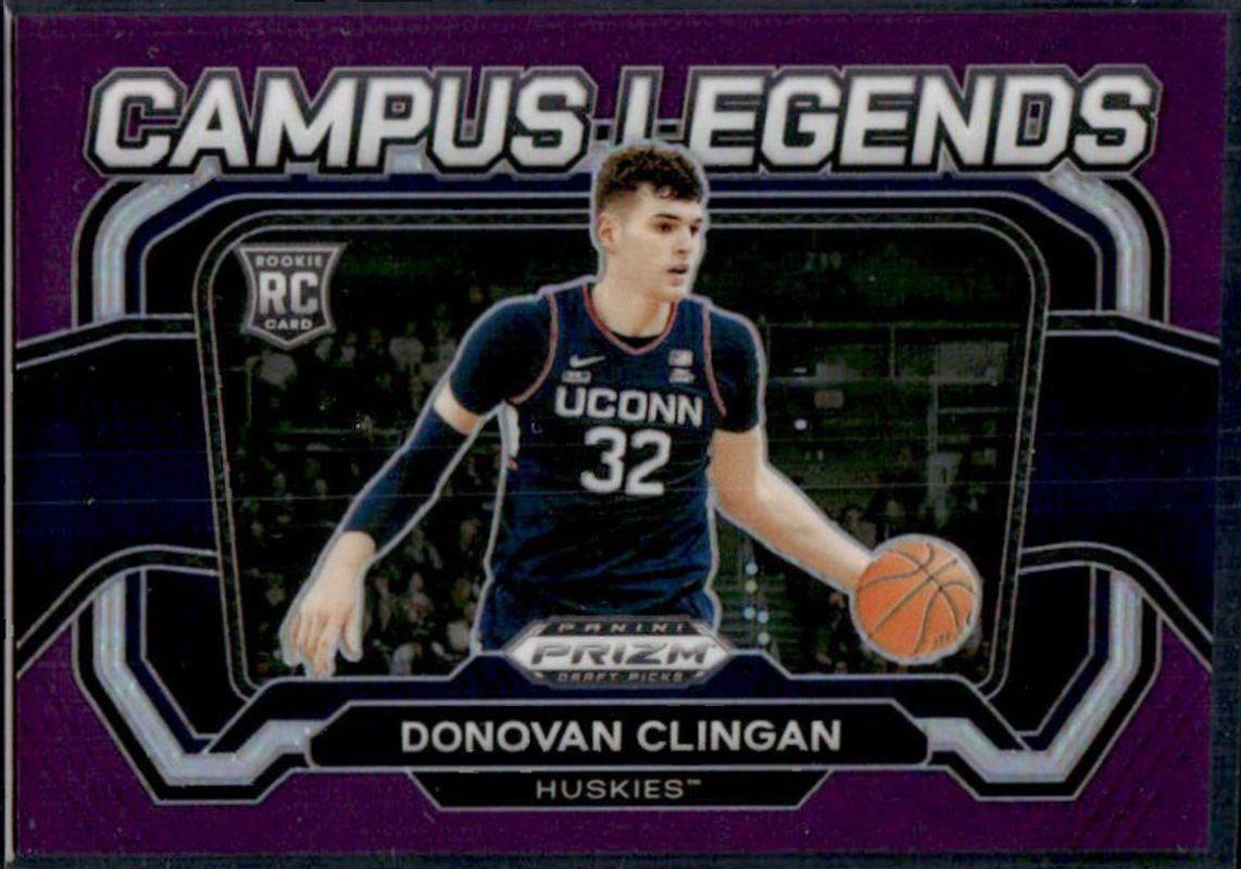 The Donovan Clingan 2024 Prizm Draft Picks #9 Campus Legends - Purple /75 Rookie card is 1 of 234 Donovan Clingan's card variations in the 2024 Prizm Draft Picks set being tracked by Sports Card Investor, including #95b Base, #95 Base, #95 Variation, #95b Green, and #95 Green.