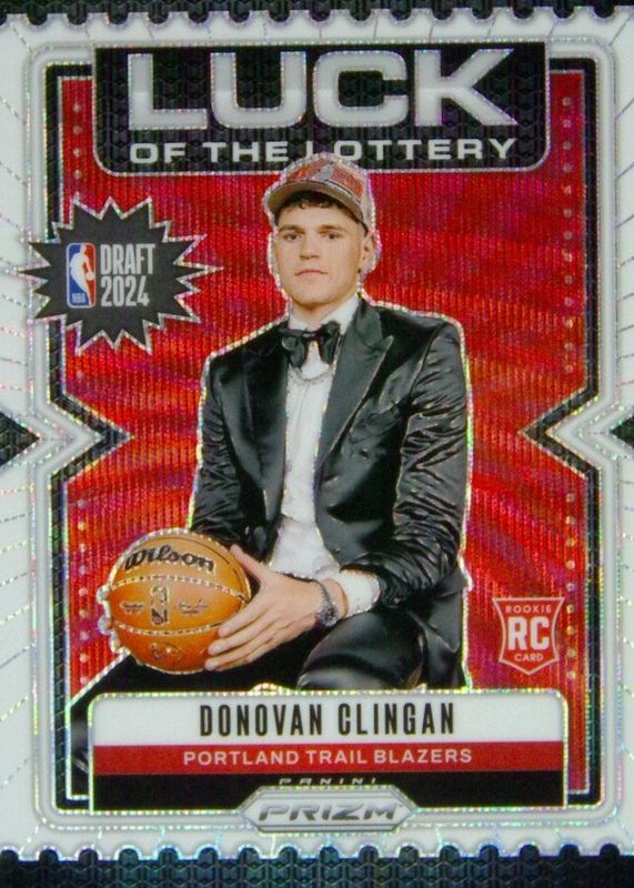 The Donovan Clingan 2024 Prizm #9 Luck of the Lottery - White Wave /20 Rookie card in Raw condition has not changed in price in the last 30 days and was last sold for $17.50 .