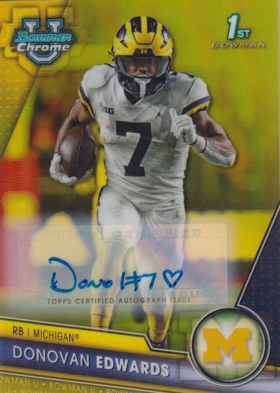 DONOVAN EDWARDS 2023 Bowman Chrome U Yellow Refractor 1st AUTO # /75 MICHIGAN