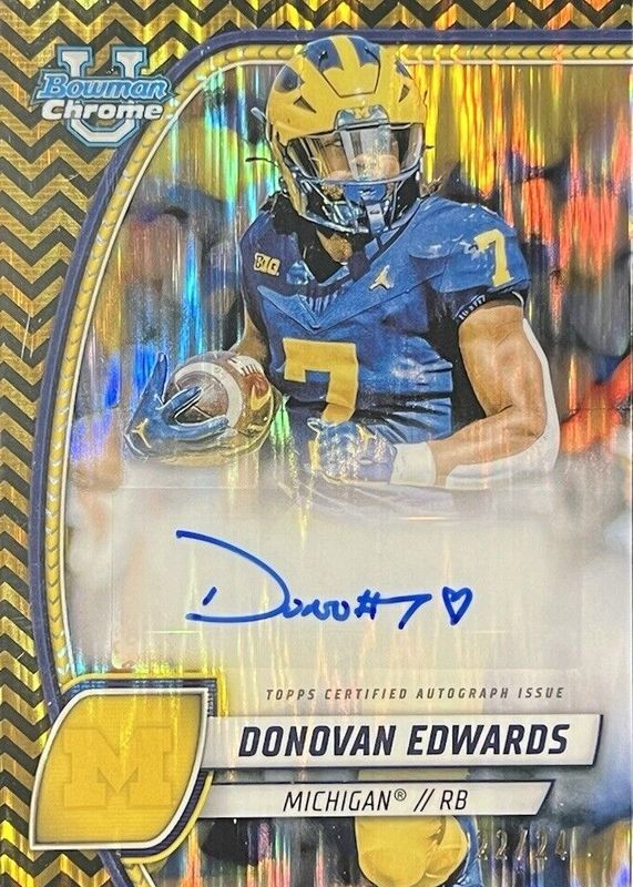 The Donovan Edwards 2024 Bowman Chrome University #PA-DED Prospect Auto - Black & Gold Stealth Refractor /24 card in Raw condition has not changed in price in the last 30 days and was last sold for $56.48 .
