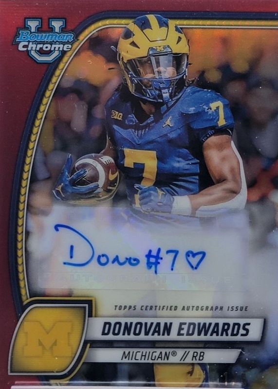 Auctions Ending Soon for Donovan Edwards 2024 Bowman Chrome University #PA-DED Prospect Auto - Red Refractor /5 RAW