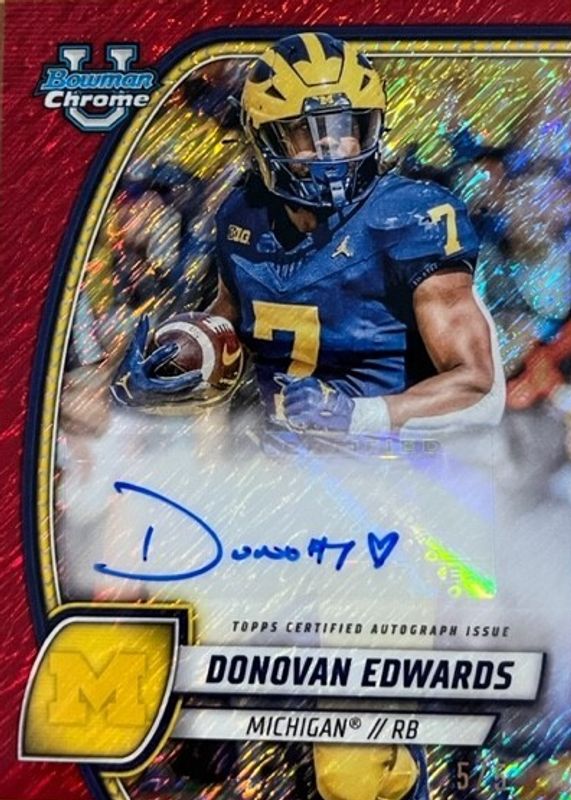 Donovan Edwards 2024 Bowman Chrome University #PA-DED Prospect Auto - Red Shimmer Refractor /5 RAW Price Guide