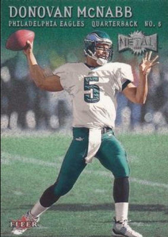 The Donovan McNabb 2000 Metal #4 Emerald card is 1 of 2 Donovan McNabb's card variations in the 2000 Metal set being tracked by Sports Card Investor, including Base.