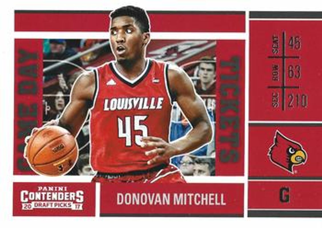 The Donovan Mitchell 2017 Contenders Draft Picks #29 Game Day Tickets Rookie card is 1 of 27 Donovan Mitchell's card variations in the 2017 Contenders Draft Picks set being tracked by Sports Card Investor, including College - Draft Ticket Blue Foil, College - Draft Ticket Red Foil, College Draft Ticket Variation - Blue Foil, College Draft Ticket Variation - Red Foil, and College Ticket Auto.