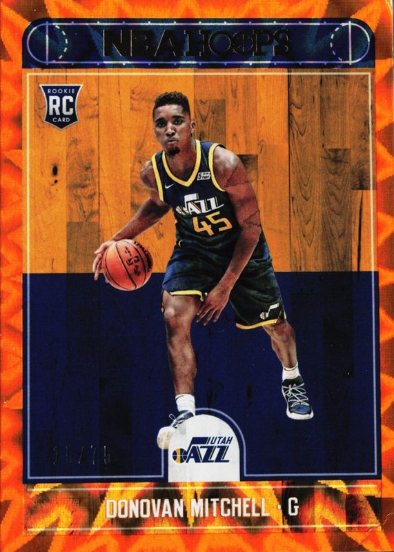 The Donovan Mitchell 2017 Hoops #263 Orange Explosion /75 Rookie card in Raw condition has not changed in price in the last 30 days and was last sold for $99.00 .