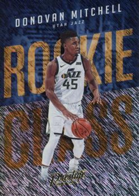 The Donovan Mitchell 2017 Prestige #13 Rookie Class - Rain card is 1 of 40 Donovan Mitchell's card variations in the 2017 Prestige set being tracked by Sports Card Investor, including Base, Bonus Shots Signatures, Bonus Shots Signatures - Crystal, Hardcourt Heroes, and Hardcourt Heroes - Crystal.