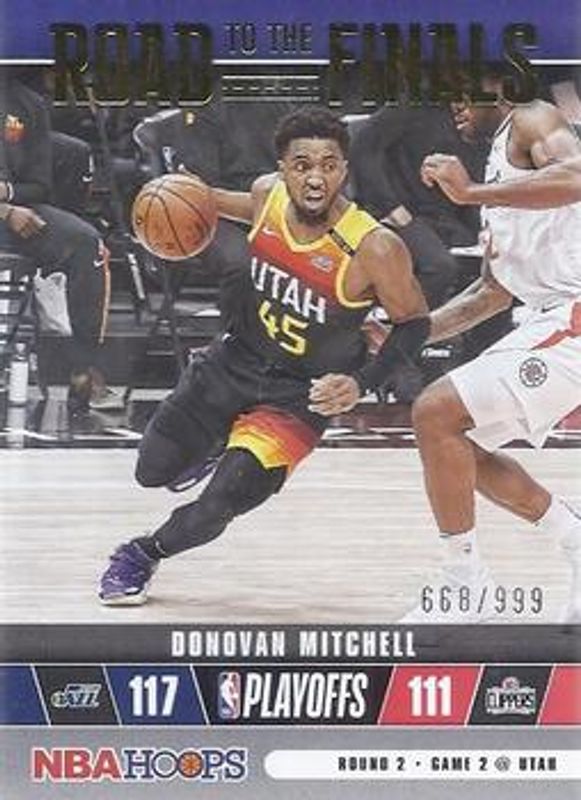 The Donovan Mitchell 2021 Hoops #52 Road to the Finals Second Round /999 card is 1 of 69 Donovan Mitchell's card variations in the 2021 Hoops set being tracked by Sports Card Investor, including Base, Anniversary Edition, Blue, Green Ice, and Hyper Blue.