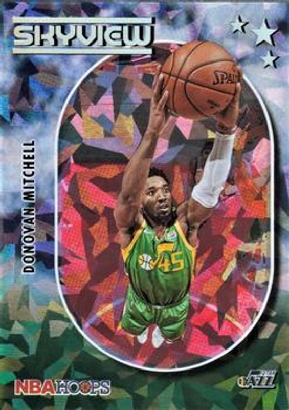 The Donovan Mitchell 2021 Hoops #8 Skyview - Green Ice card is 1 of 69 Donovan Mitchell's card variations in the 2021 Hoops set being tracked by Sports Card Investor, including Base, Anniversary Edition, Blue, Green Ice, and Hyper Blue.