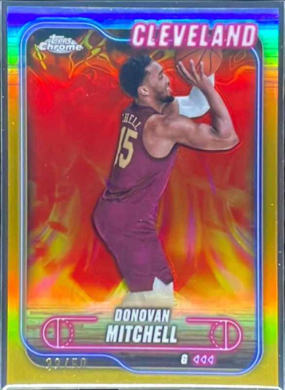 The Donovan Mitchell 2024 Topps Chrome #69 Gold Refractor /50 card is 1 of 80 Donovan Mitchell's card variations in the 2024 Topps Chrome set being tracked by Sports Card Investor, including Base, Blue Basketball Refractor, Magenta Refractor, Negative Refractor, and Pink Basketball Refractor.