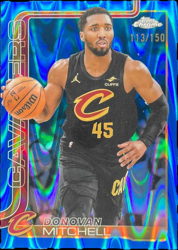 The Donovan Mitchell 2025 Topps Chrome #69 Blue RayWave Refractor /150 card is 1 of 202 Donovan Mitchell's card variations in the 2025 Topps Chrome set being tracked by Sports Card Investor, including Base, Basketball Refractor, Box Set Refractor, Image Variation, and Lightboard Logo Refractor.