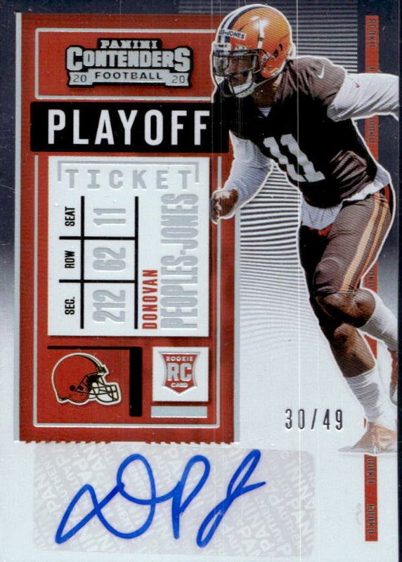 The Donovan Peoples-Jones 2020 Contenders #210 Rookie Ticket Auto Variation - Playoff Ticket /49 card in Raw condition has not changed in price in the last 30 days and was last sold for $25.00 .