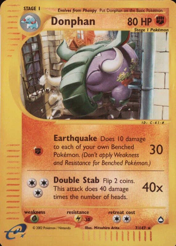 The Donphan 2003 Aquapolis #007/147 Reverse Holo card in Raw TCG (Near Mint) condition has not changed in price in the last 30 days and was last sold for $36.00 .
