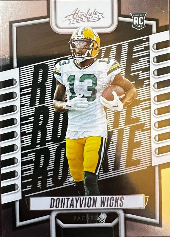 The Dontayvion Wicks 2023 Absolute #199 Base Rookie card in Raw condition has not changed in price in the last 30 days and was last sold for $1.42 .