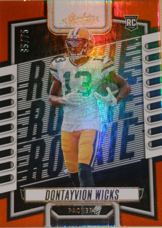 The Dontayvion Wicks 2023 Absolute #199 Orange Spectrum /75 Rookie card in Raw condition has not changed in price in the last 30 days and was last sold for $2.95 .