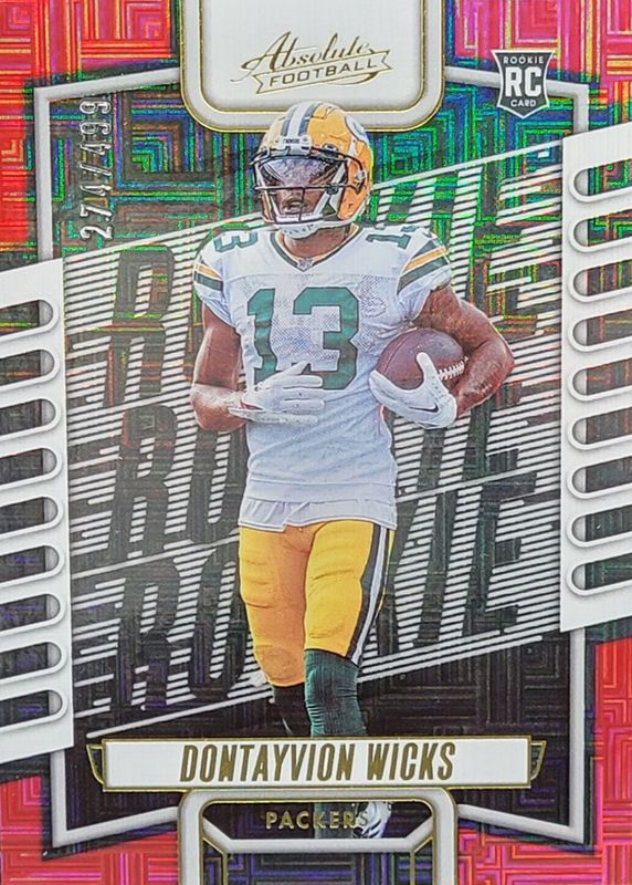 The Dontayvion Wicks 2023 Absolute #199 Red Squares /499 Rookie card in Raw condition has not changed in price in the last 30 days and was last sold for $1.04 .