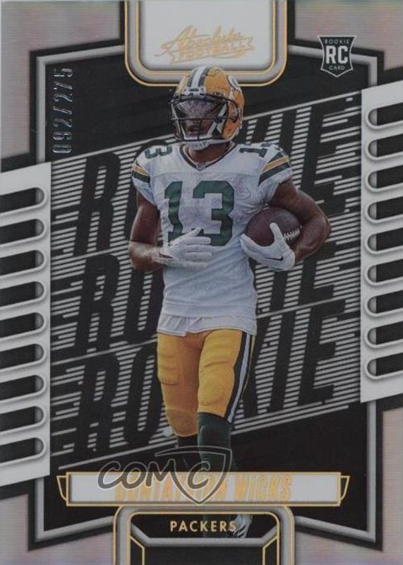The Dontayvion Wicks 2023 Absolute #199 Spectrum /275 Rookie card in Raw condition has not changed in price in the last 30 days and was last sold for $3.99 .