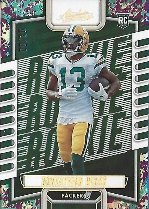 The Dontayvion Wicks 2023 Absolute #199 Splash Spectrum /16 Rookie card in Raw condition has not changed in price in the last 30 days and was last sold for $54.00 .