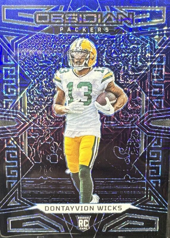 The Dontayvion Wicks 2023 Obsidian #138 Electric Etch Deep Sea Mojo /5 Rookie card in Raw condition has not changed in price in the last 30 days and was last sold for $101.13 .