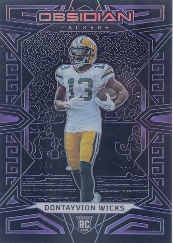 The Dontayvion Wicks 2023 Obsidian #138 Electric Etch Purple /75 Rookie card in Raw condition has not changed in price in the last 30 days and was last sold for $3.80 .