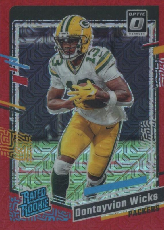 The Dontayvion Wicks 2023 Optic #249 Red Mojo Rookie card in Raw condition has not changed in price in the last 30 days and was last sold for $5.00 .