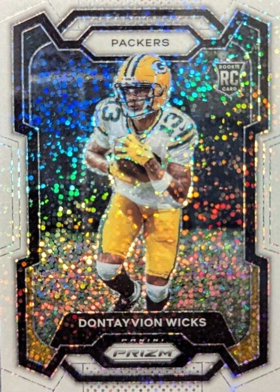 The Dontayvion Wicks 2023 Prizm #333 White Sparkle /(SSP) Rookie card in Raw condition has not changed in price in the last 30 days and was last sold for $95.00 .