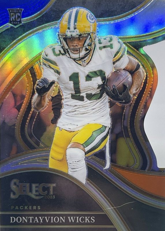 The Dontayvion Wicks 2023 Select #271 Club Level Blue & Orange Die-Cut /35 Rookie card in Raw condition has not changed in price in the last 30 days and was last sold for $19.99 .