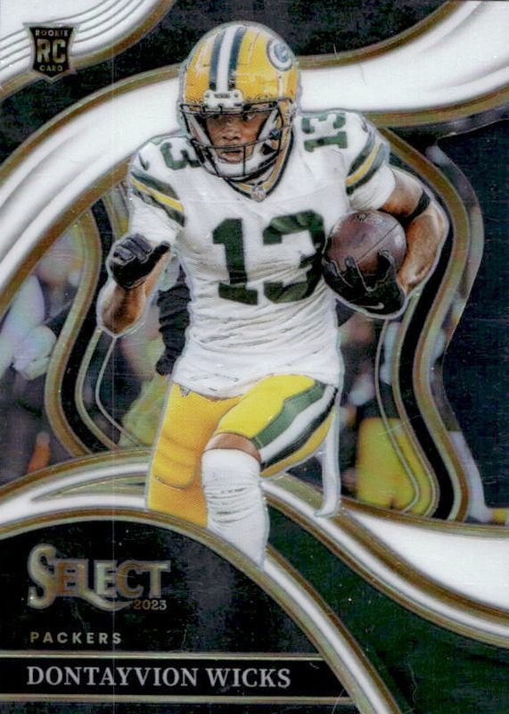This card is 1 of 42 Dontayvion Wicks' card variations in the 2023 Select set being tracked by Sports Card Investor, including Club Level, Club Level Black & Gold Die-Cut, Club Level Black & Green Die-Cut, Club Level Black & Red Die-Cut, and Club Level Disco.