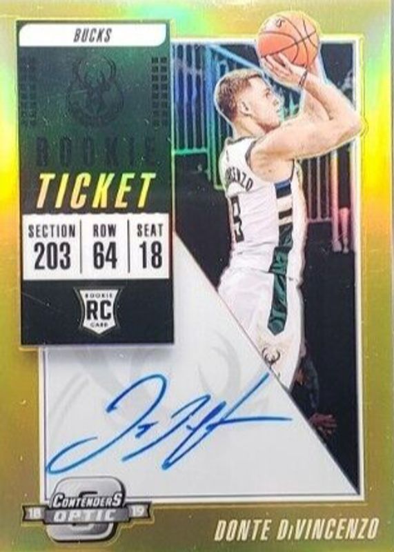 The Donte DiVincenzo 2018 Contenders Optic #121 Rookie Ticket Auto - Gold /10 (White Jersey) card in Raw condition has not changed in price in the last 30 days and was last sold for $187.50 .