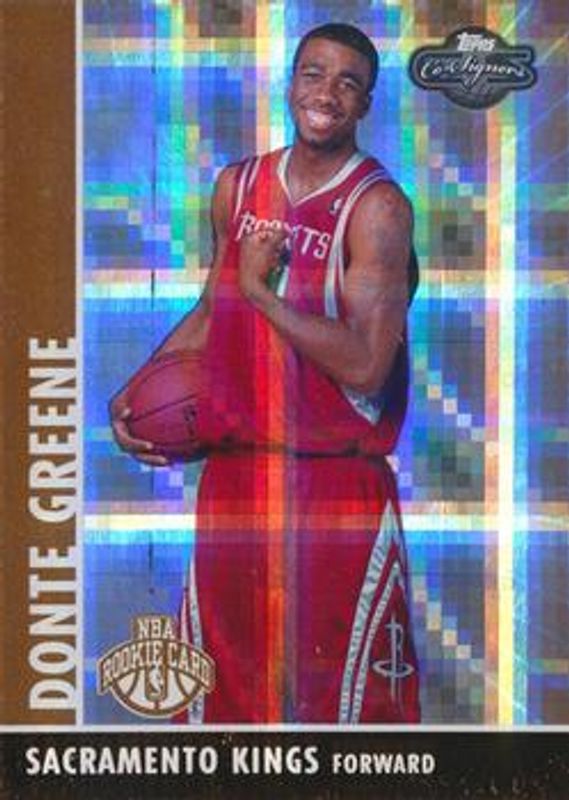 The Donte Greene 2008 Topps Co-Signers #123 Hyper Bronze /50 Rookie card is 1 of 19 Donte Greene's card variations in the 2008 Topps Co-Signers set being tracked by Sports Card Investor, including Bronze /299, Silver /199, Gold /99, Hyper Silver /25, and Hyper Gold /10.